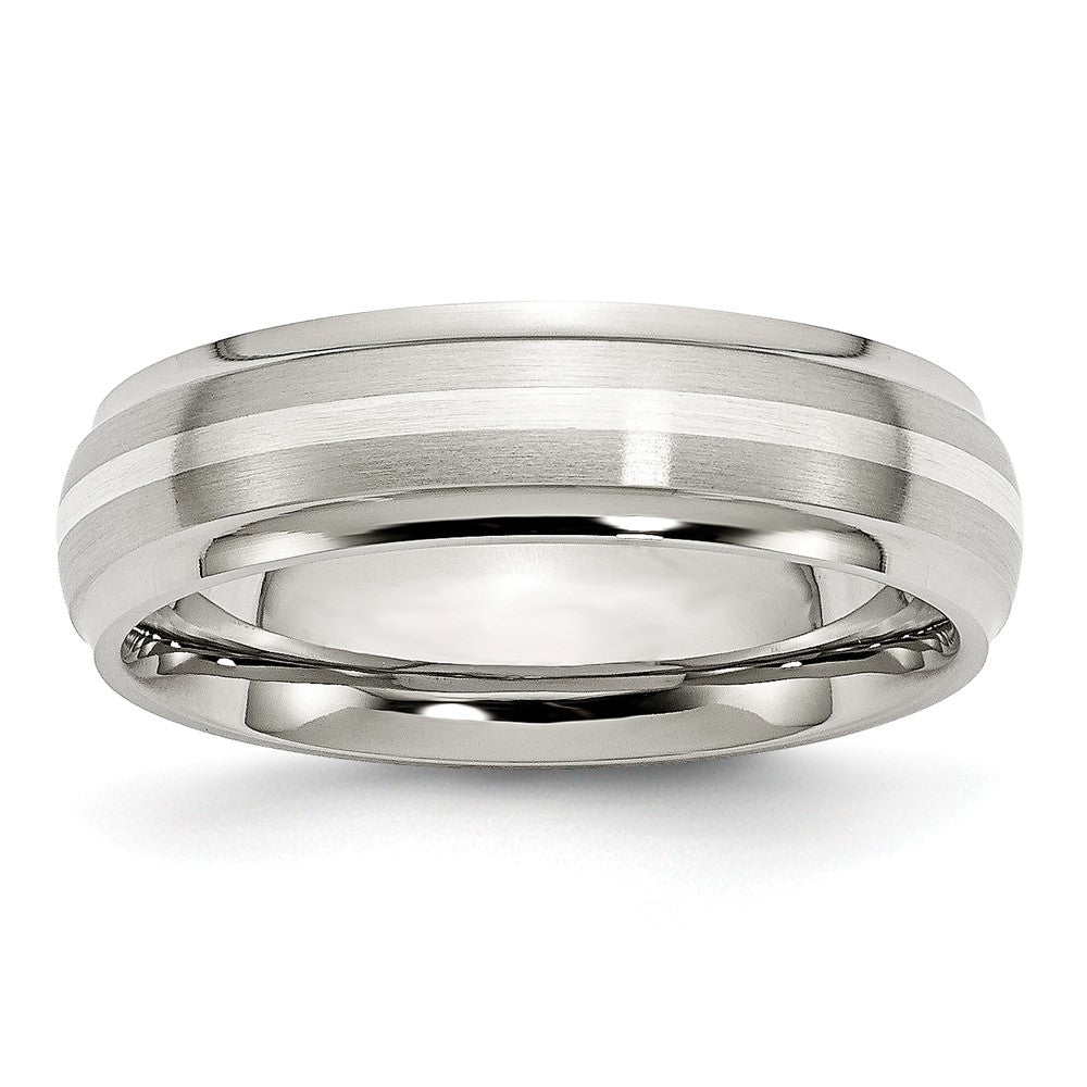 Stainless Steel Wedding Band with Sterling Silver Inlay and Ridged Edge