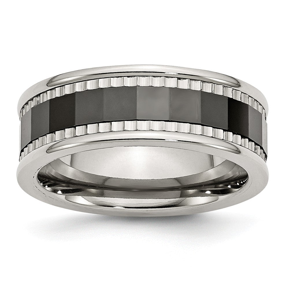 Enhance your personal style with this stunning Stainless Steel Band featuring a distinctive sawtooth accent design and a sleek black ceramic center. This piece effortlessly combines modern elegance with durable craftsmanship, making it the perfect choice for anyone seeking a refined yet bold statement. With its faceted edges catching the light at every angle, this band exudes sophistication, while its polished stainless steel finish ensures long-lasting strength. Whether you're wearing this as a wedding band or a daily accessory, this ring is designed for those who appreciate luxury and style in every detail.