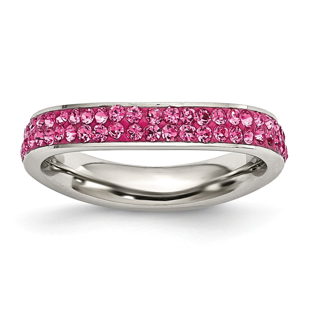 Adorned with 96 stunning pink crystals, each meticulously arranged in a round shape and set into polished stainless steel, this ring adds a brilliant pop of color to any look. The narrow 4mm width is chic enough for daily wear, while the reflective polished finish guarantees subtle sparkle at every angle.
