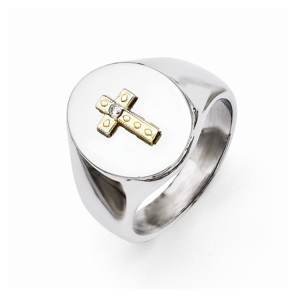 Stainless Steel Ring with 10K Gold Cross and .02ct Diamond – Polished Elegance