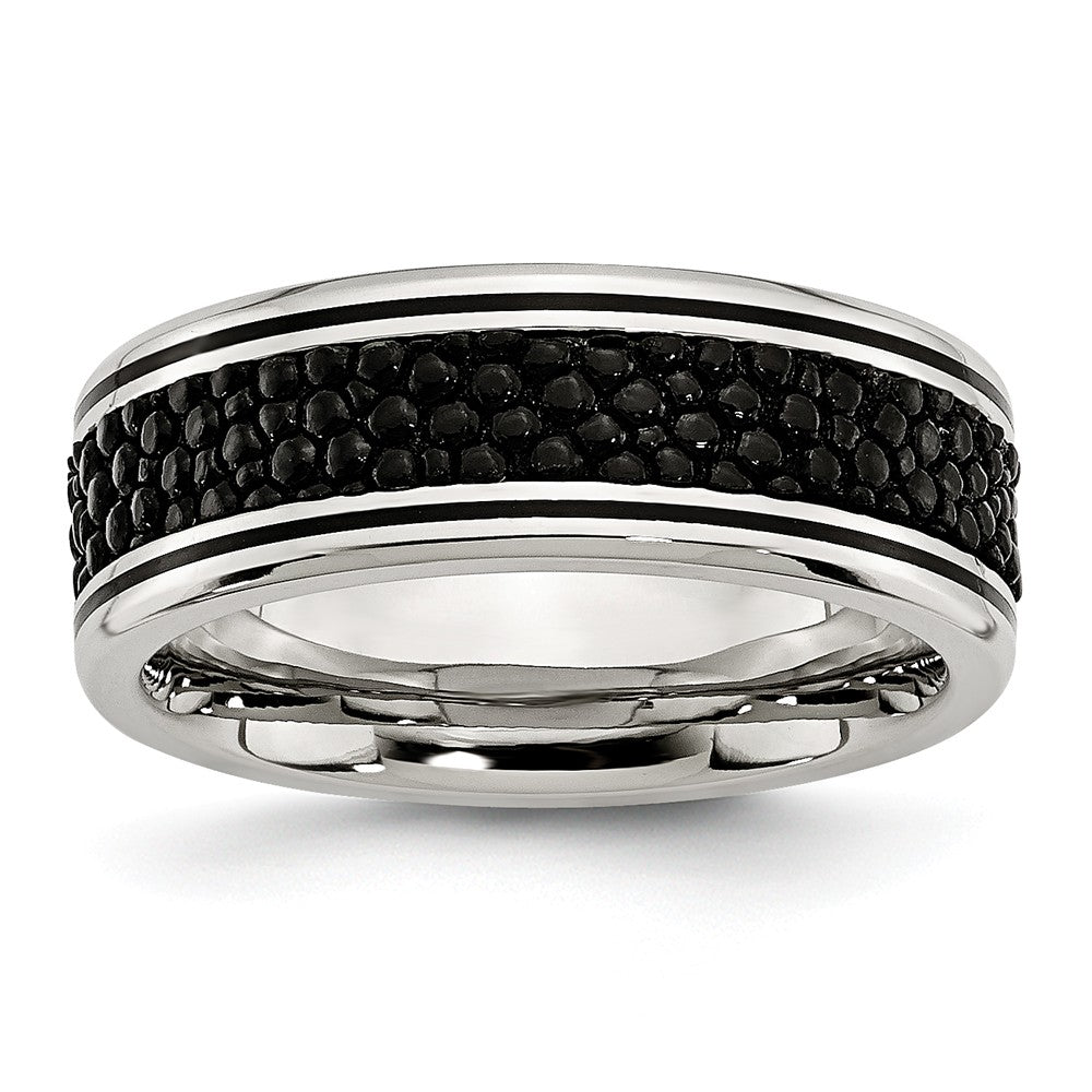 With its sleek polish and textured elegance, this ring makes a statement of both love and individuality. Add this exclusive Stainless Steel Polished Grooved/Genuine Stingray Textured 8mm Ring to your cart today and make your special moments last a lifetime.