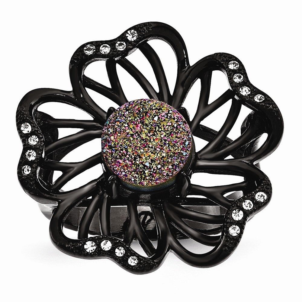 Stainless Steel Polished Black IP-plated Druzy and Crystal Ring