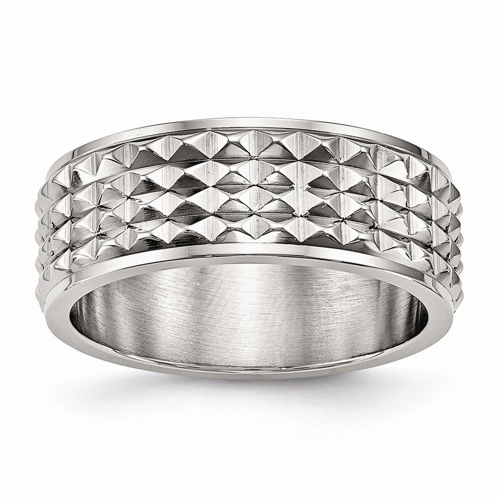Discover the perfect blend of modern sophistication and enduring strength with this Stainless Steel Polished Studded Ring. Crafted to perfection, this wedding band showcases a mirror-like polished finish and a powerful 8mm width, making it the ideal statement piece for those who want their jewelry to combine both elegance and durability.