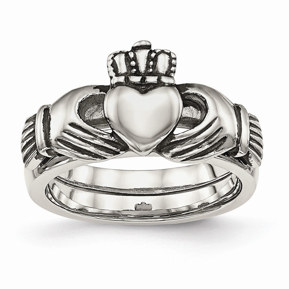 The timeless appeal of stainless steel guarantees a pristine, long-lasting finish, resistant to tarnishing, while the polished and antiqued surfaces add depth and character. A perfect mix of elegance and sentimentality, this Claddagh ring is not just a piece of jewelry—it’s a meaningful symbol of the bonds that matter most.