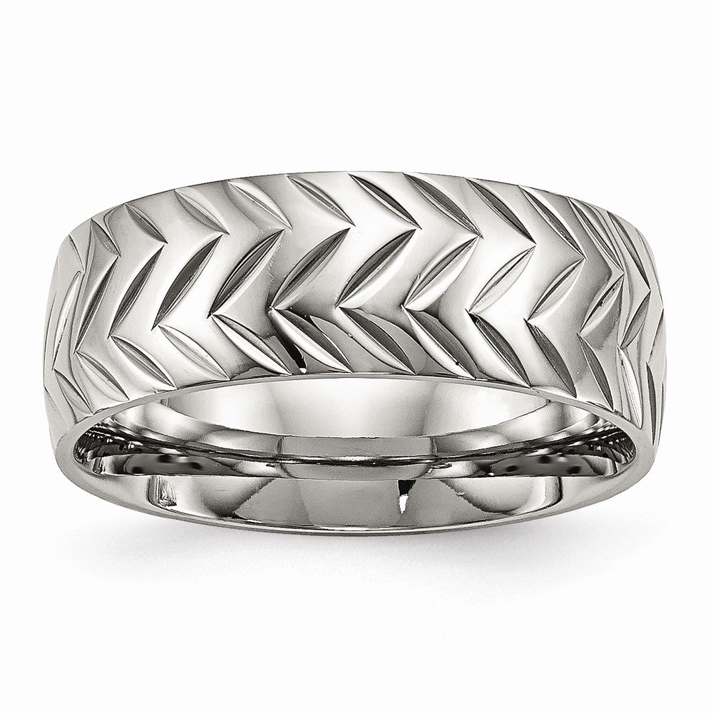 The polished stainless steel finish accentuates the ring's contemporary look while its diamond-cut design adds a unique, eye-catching texture. At a band width of 8 mm, it strikes the perfect balance of comfort and style, offering a feel of substance without compromising on wearability. Whether you’re looking to mark a special occasion or simply elevate your everyday aesthetic, this ring is a symbol of strength, modernity, and refined taste.
