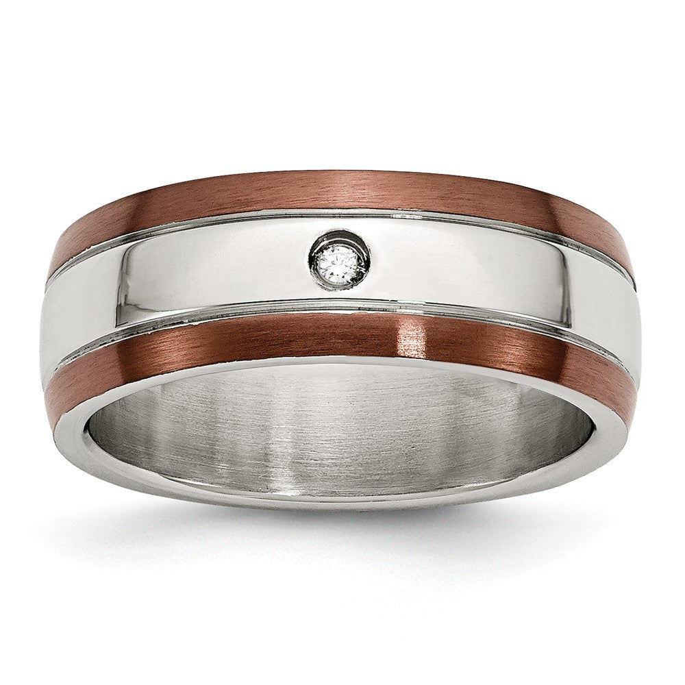 Elevate your style with our Stainless Steel Brown IP-Plated Brushed w/Diamond Band – an exquisite blend of modern sophistication and enduring charm. Crafted with precision, this stunning 8mm wide band balances a sleek, brushed finish with polished edges for a captivating contrast that’ll turn heads. Whether as a wedding band or a statement piece, its stunning blend of materials and design makes it the perfect choice for someone with refined tastes.
