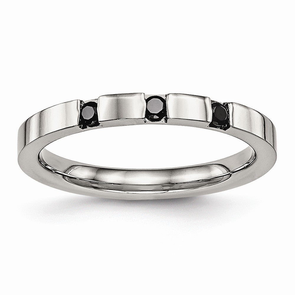 Celebrate your unique style and modern elegance with this eye-catching Stainless Steel Polished 3 Stone Black CZ 2.50mm Band. A sophisticated alternative to traditional rings, this band blends sleek design with the striking allure of black cubic zirconia stones. Its stunning combination of polished stainless steel and synthetic 3-stone black CZ creates a perfect symbol of love, strength, and individuality.