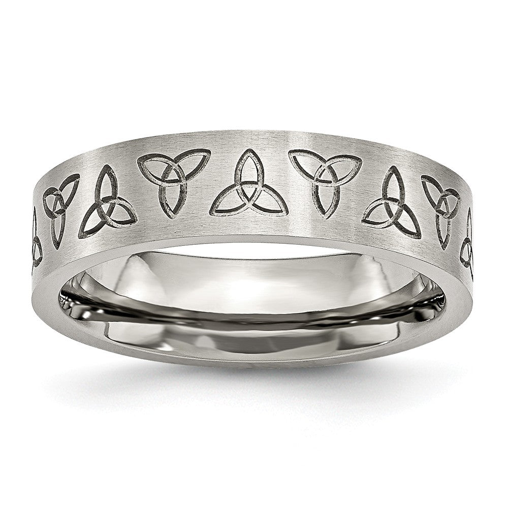 Introducing the Stainless Steel Engraved Trinity Symbol Brushed 6mm Band – a timeless representation of unity and everlasting love. This beautifully crafted band, made from high-quality stainless steel, combines contemporary elegance with symbolic meaning to deliver an eye-catching piece you will be proud to wear and cherish.