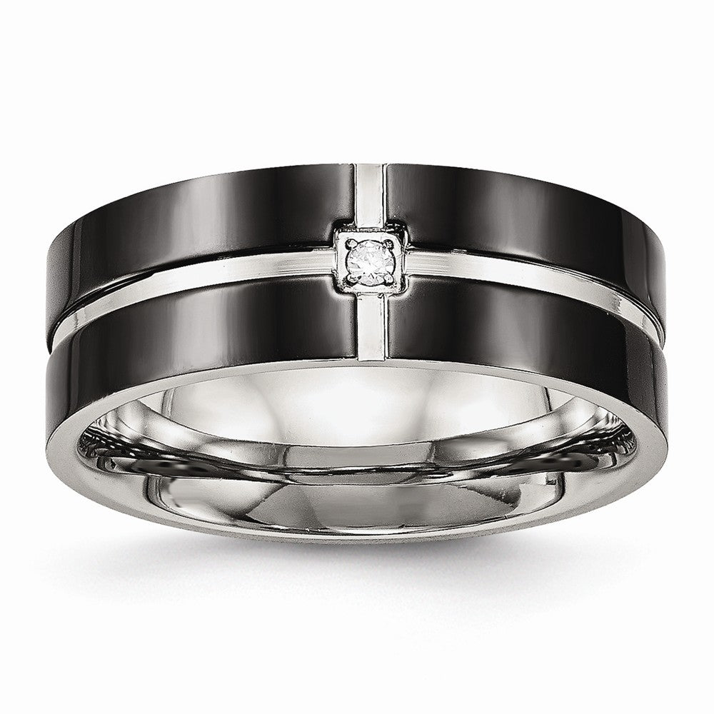 Elevate your look with the bold and striking elegance of our Stainless Steel Polished Black IP Grooved Ring. Thoughtfully crafted from high-quality stainless steel, this ring features a sleek polished black IP-plated finish, making it the perfect choice for a modern wedding band or a sophisticated accessory. Its central groove is carefully embedded with a stunning, synthetic cubic zirconia stone, adding a brilliant contrast to its dark, captivating design.
