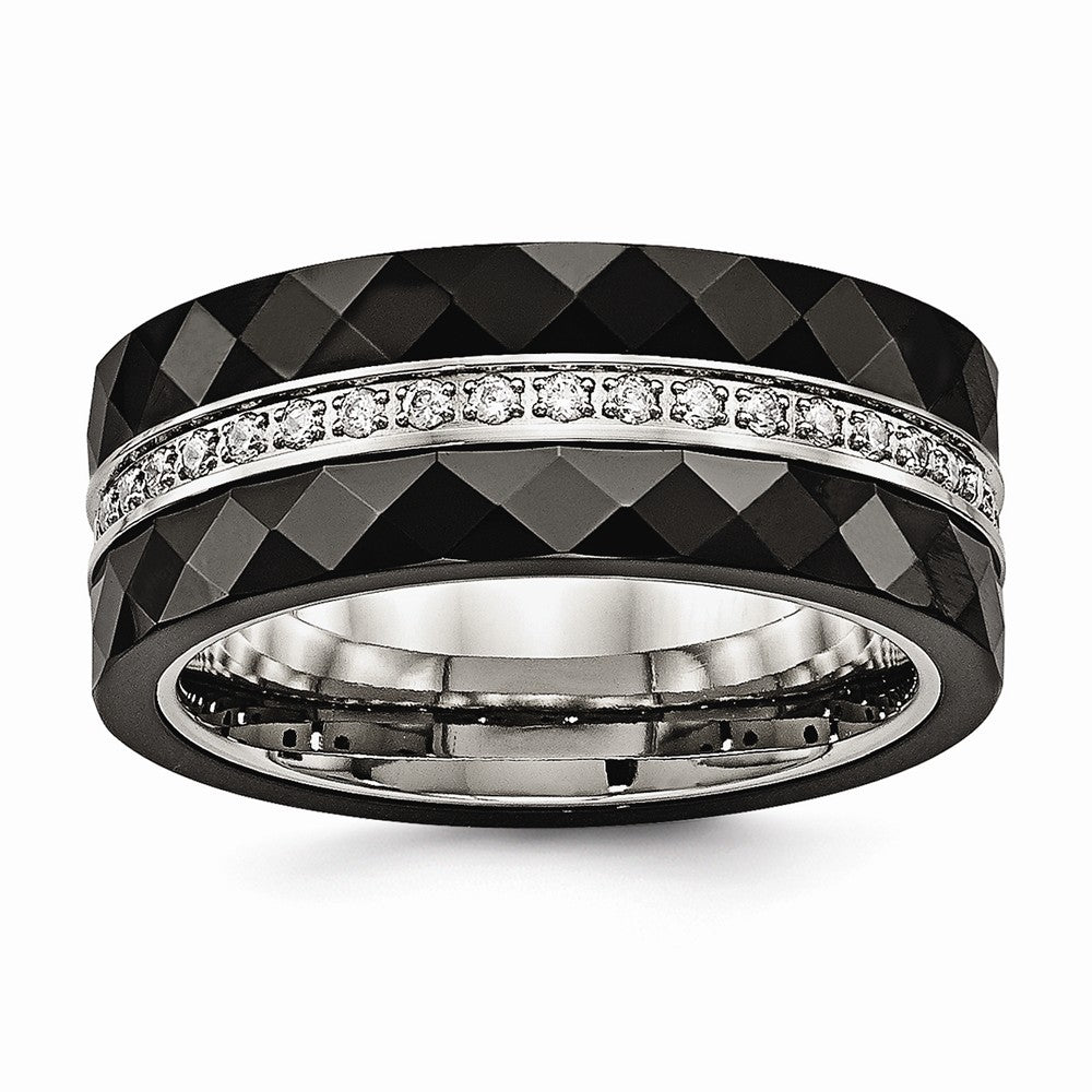 Elevate your style with the Stainless Steel Polished Faceted Black Ceramic CZ Ring, a stunning piece that blends modern sophistication with timeless elegance. Perfect for wedding bands or a sleek, stylish addition to your everyday jewelry collection, this ring encapsulates the essence of both durability and luxury.