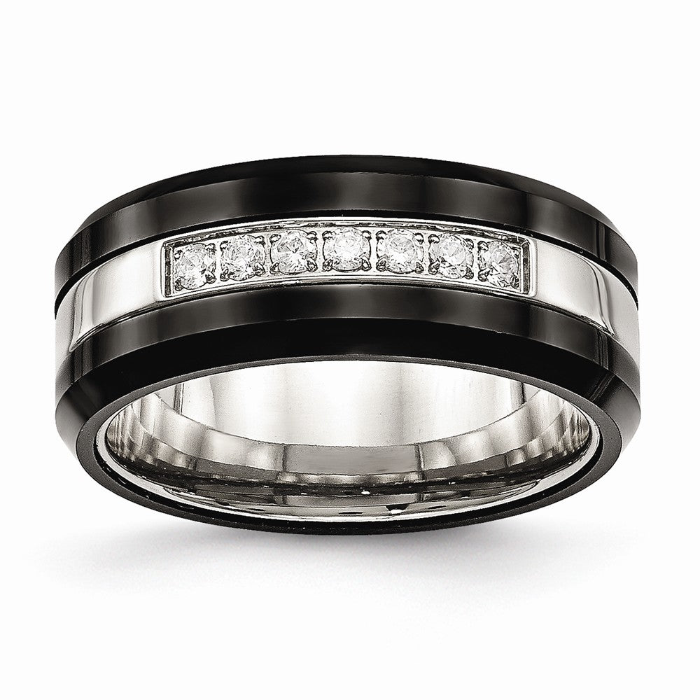 Stainless Steel Polished Black Ceramic CZ Beveled Edge Ring - Bold Sophistication with Timeless Elegance