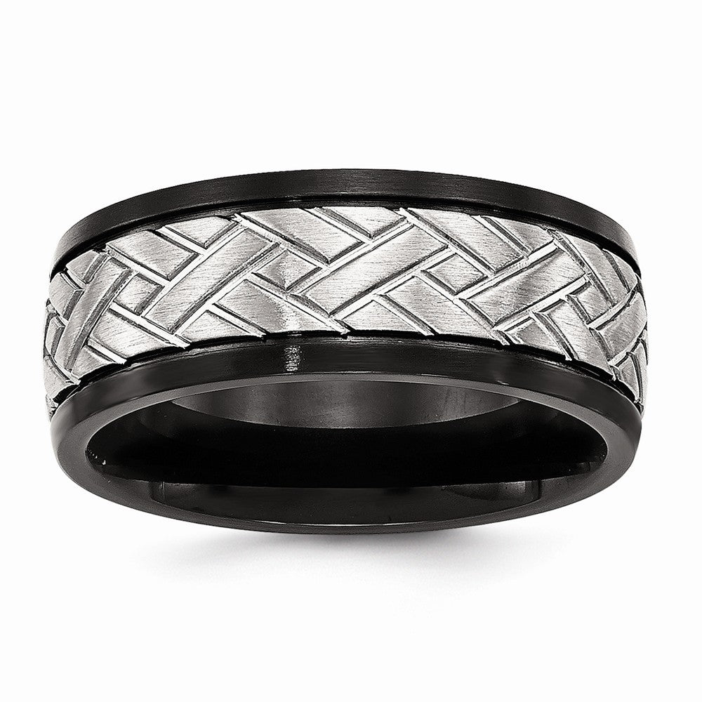 Crafted from high-quality stainless steel, this durable ring is finished with a brushed texture for a sleek, satin appearance. The distinctive black IP-plated grooved design adds depth and emphasis to its structured form, making this ring perfect for anyone seeking a modern yet versatile accessory that can transition effortlessly from day to night. Whether it's for a wedding band or a stylish addition to your everyday wardrobe, this ring is designed with a perfect balance of comfort and class.