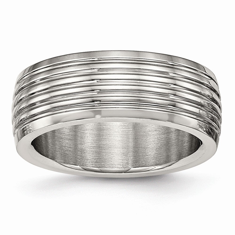 Elevate your style with this timeless Stainless Steel Polished Grooved Ring, designed to exude sophistication and strength. Its sleek, polished finish and bold 8mm width make it the perfect accessory for both modern and classic looks. Whether you're commemorating a milestone or searching for a chic and durable ring for everyday wear, this piece offers a harmonious balance of elegance and ruggedness that won't fade over time.