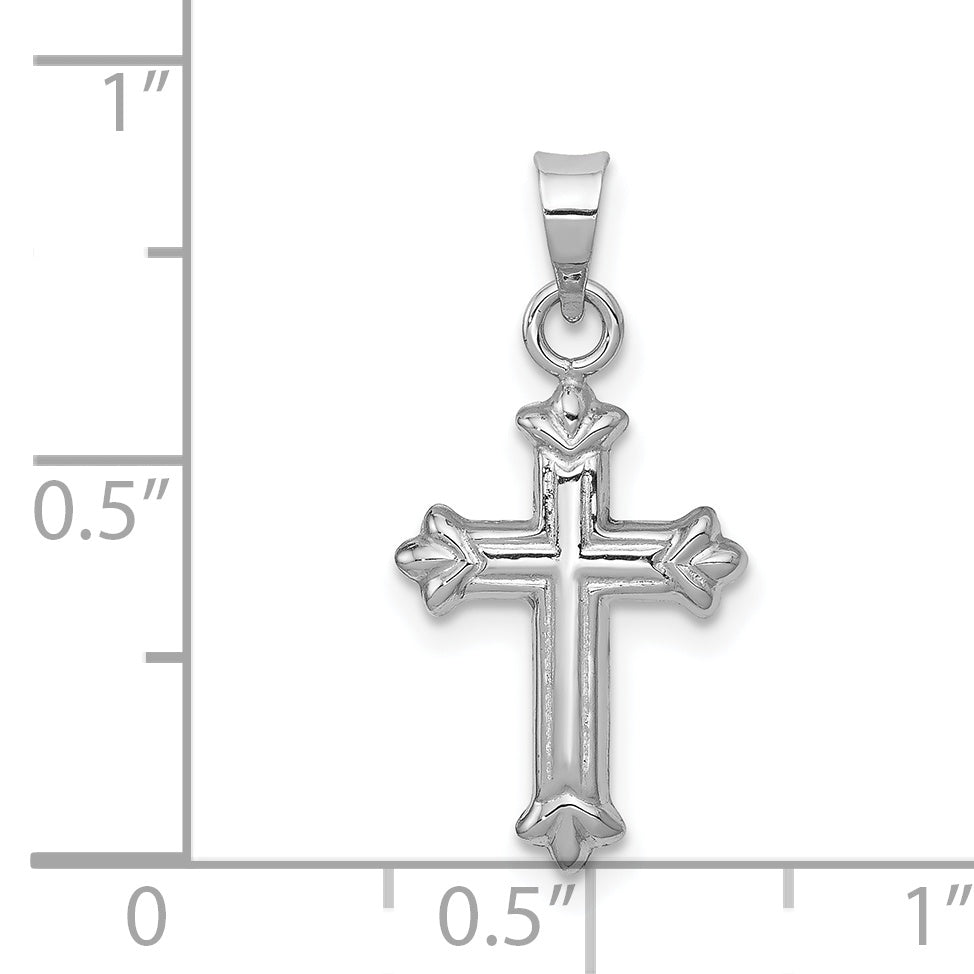 Crafted from premium 14K white gold, this charm not only shines with polished brilliance, but also features rhodium plating for enhanced durability and a tarnish-resistant finish. Its hollow design gives it a lightweight yet sturdy feel, making it an ideal choice for everyday wear or special occasions. The Fleur de Lis accents on the cross add an extra layer of elegance, making this charm a standout item in any collection.