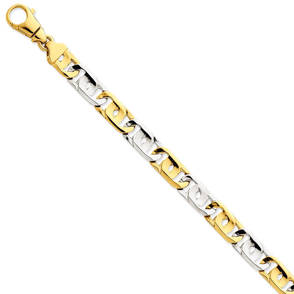 The contrast of two-tone 14K gold in polished, meticulously casted fancy links creates a captivating display of brilliance and intricate design. Whether you're enhancing your formal look or adding a unique edge to casual attire, this eye-catching piece will ensure you're unforgettable.