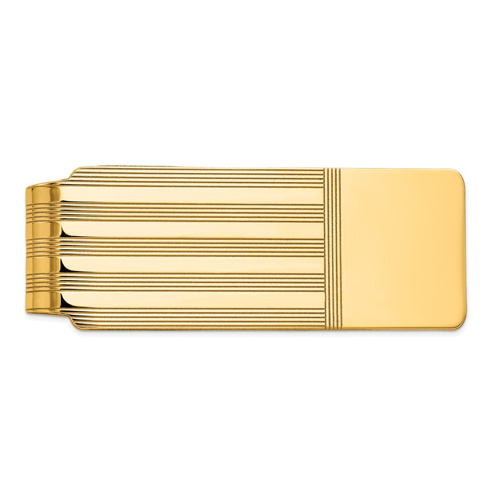 Make a bold yet refined statement with our 14K Men's Grooved Polished Money Clip—an accessory that effortlessly marries timeless elegance with everyday utility. Crafted in luxurious 14K yellow gold, this money clip is designed for the discerning gentleman who values both style and practicality. Ideal for organizing your cash and cards without the bulk of a traditional wallet, it's not just an accessory—it's a statement piece.