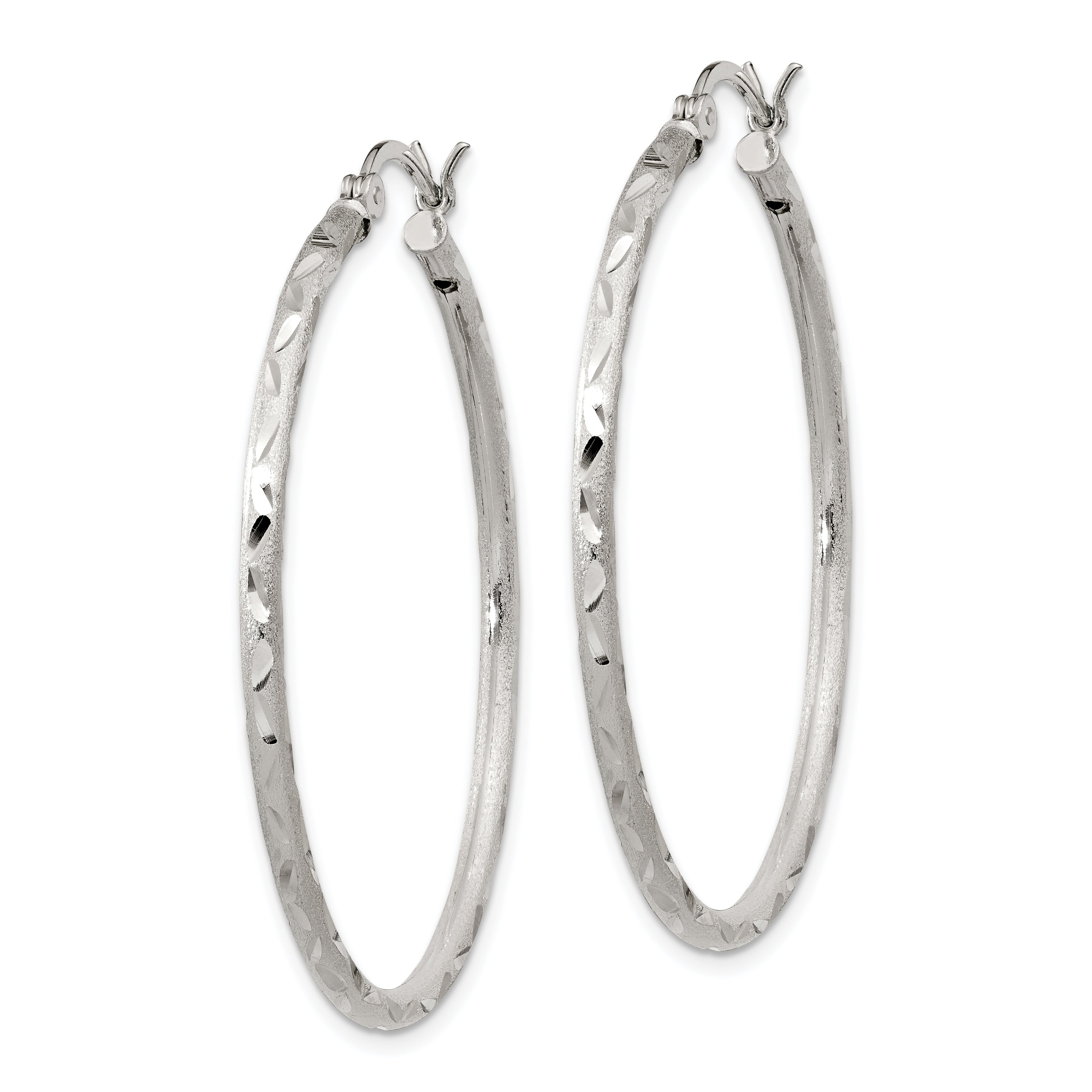 Add a touch of sophistication to your jewelry collection. Whether you're dressing up for an event or adding a touch of charm to your everyday look, these Sterling Silver Satin Diamond-Cut 2x40mm Hoops will become your go-to accessory.