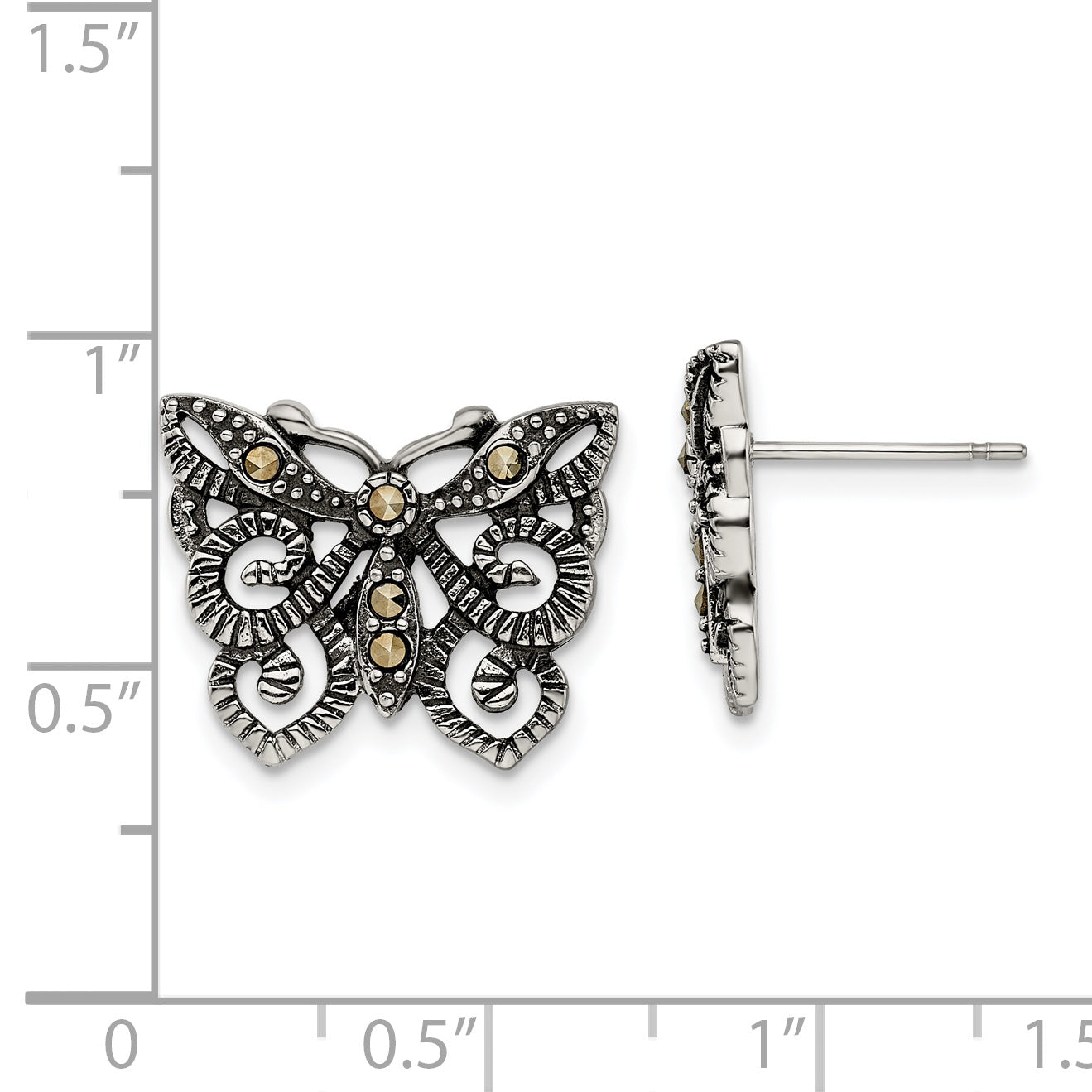 Stainless Steel Antiqued and Polished Marcasite Butterfly Post Earrings