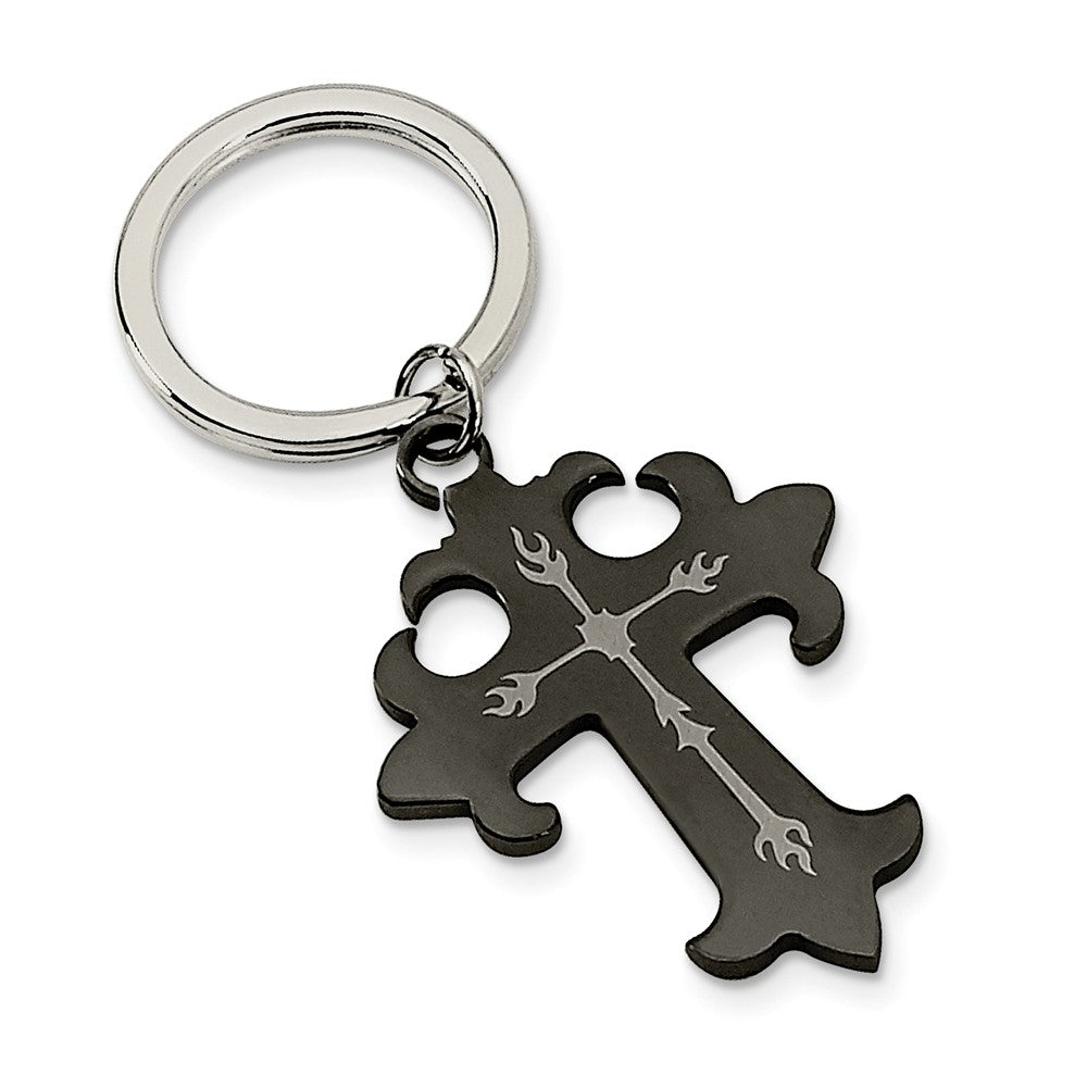Chisel Stainless Steel Polished Black IP-Plated Cross Key Ring