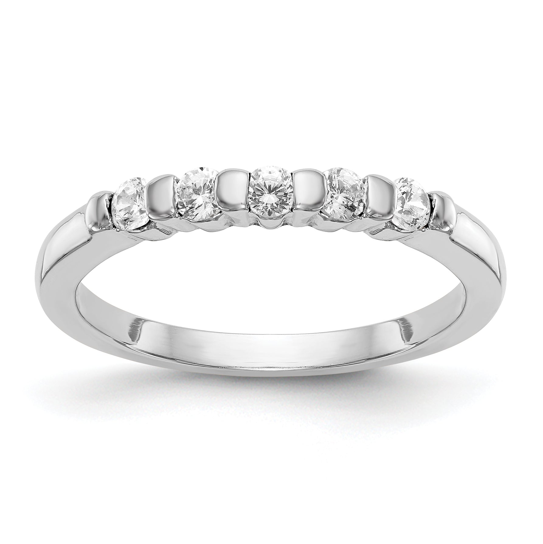 Item Specification: Material: Primary - Purity:14K Finish:Polished Stone Type_1:Center Stone Mounting(s) Stone Quantity_1:5 Plating:Rhodium Band Width:3 to 1.2 mm (tapered) Stone Weight_1:0.05 ct Size (Minimum):5 Size (Maximum):9 Sizing Adjustment Increment:0.25...